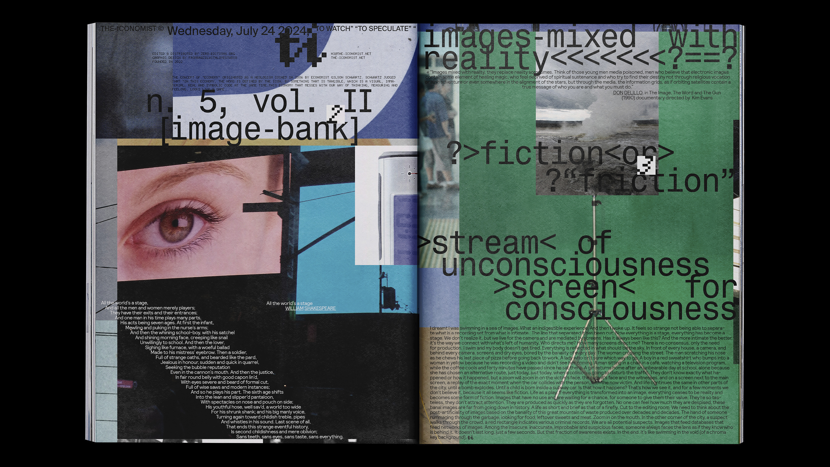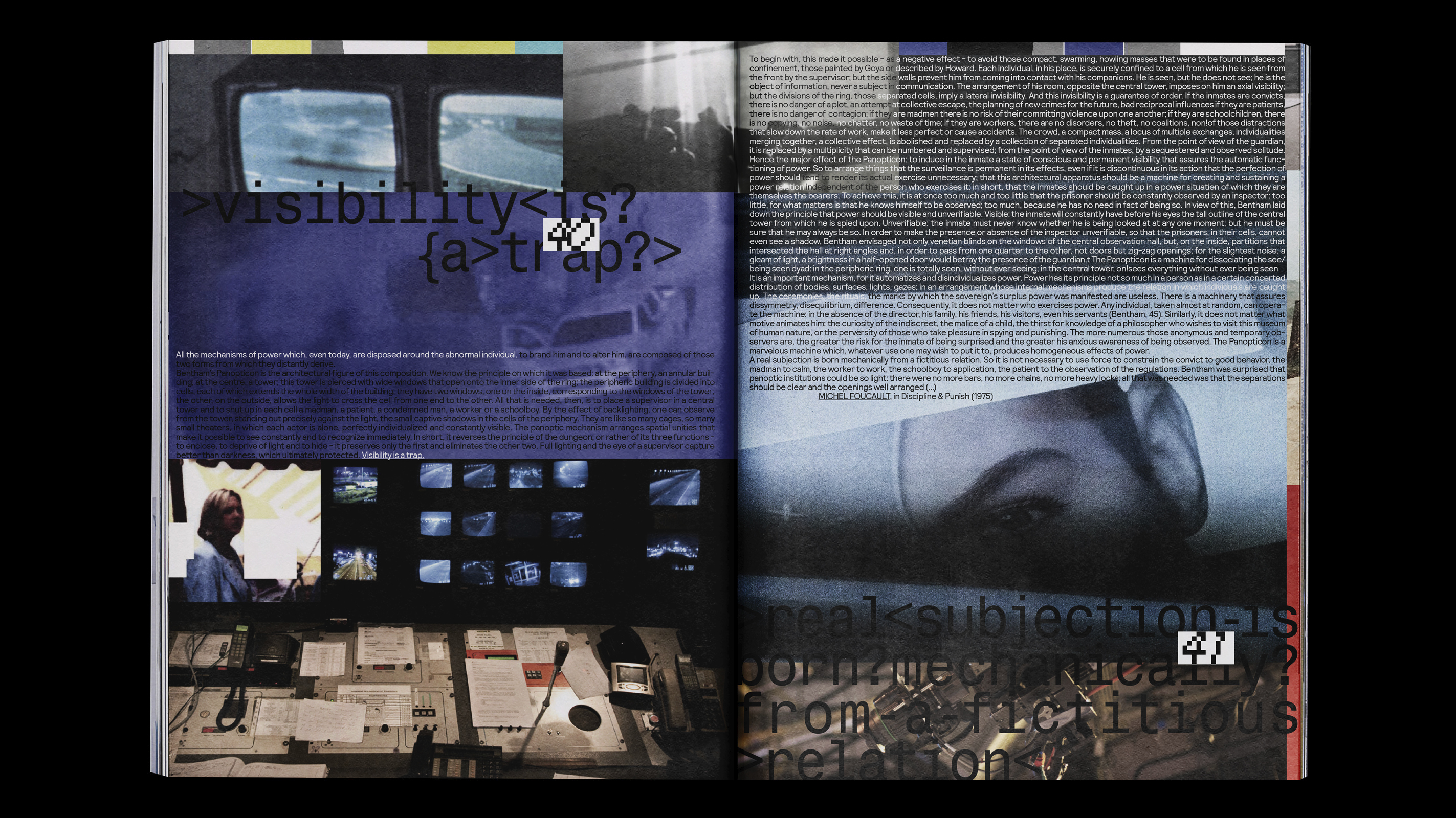 Nº 5. Inaugurating its new volume of publications, THE-ICONOMIST presents an unusual thematic dossier built around the verbs “To watch” and “To speculate”. Inspired by excerpts from Michel Foucault’s book “Discipline and Punish: The Birth of The Prison” and William Shakespeare’s poem “All The World’s A Stage”, we explore the complex issues of surveillance in the digital age and the role of security cameras in contemporary society. Instead of creating images generated by artificial intelligence, we decided to delve into the vast banks of digital images available on servers around the world. This method seeks to give new meaning to an often forgotten arsenal of imagery, visually composing this issue with authentic and historically charged material. Through this volume, we address crucial themes such as privacy and power, violence and social behavior, technology and ethics. In addition, we have enriched our analysis with selected texts by renowned authors such as Octavia Butler, Don DeLillo, Jean Baudrillard, Thomas Elsaesser, Anne Carson, Guy Debord, Marshall McLuhan and Barbara Kruger, among others.